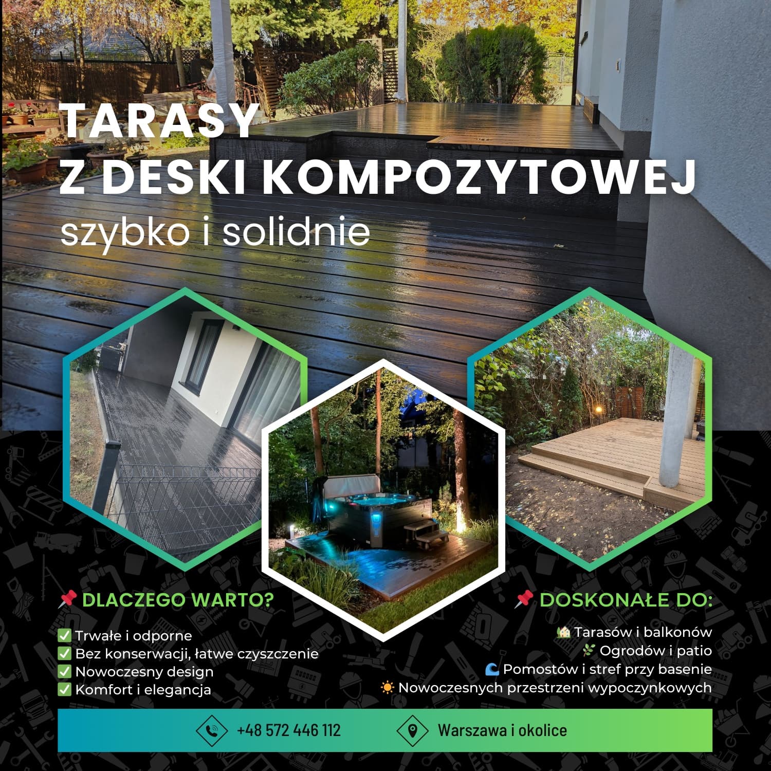 Od kilku lat specjalizuję się w budowie tarasów z deski kompozytowej, zakładaniu trawników z rolki oraz pielęgnacji ogrodów (cięcie i formowanie tui).